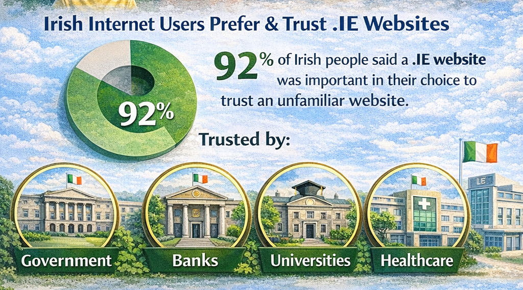 Research consistently shows that Irish internet users place higher trust in .IE websites when making purchasing decisions or sharing personal information. This is reflected in the behaviour of Irish government bodies, banks, universities, and healthcare providers — almost all of whom use .IE domains.